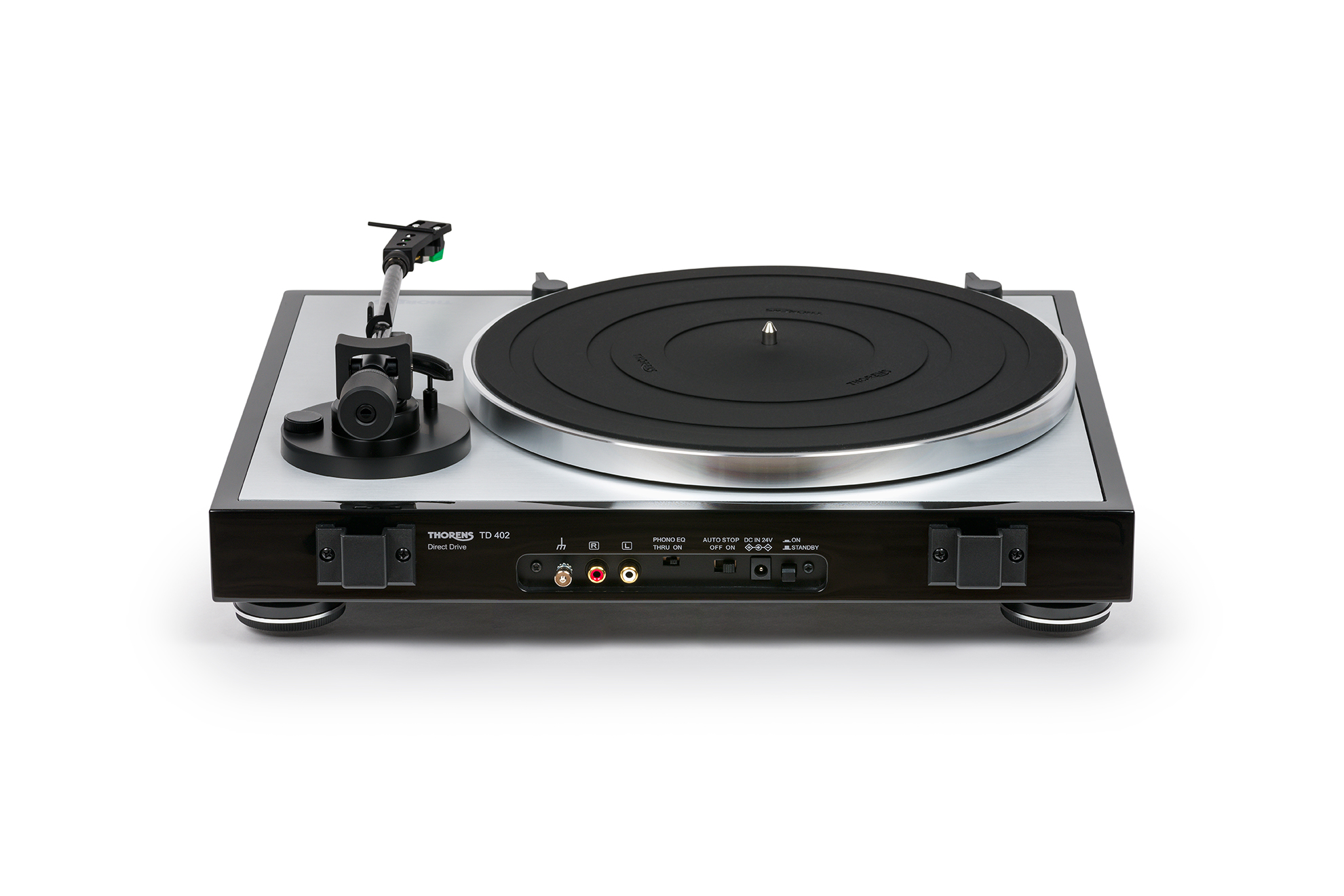 Der Thorens TD 402 DD ist eine „out-of-the-box“ spielfertige Lösung mit innovativem, sehr laufruhigen Direktantrieb in Kombination mit Komfortfunktionen wie integriertem Phonovorverstärker und Auto-Start und Auto-Stop am Plattenende.